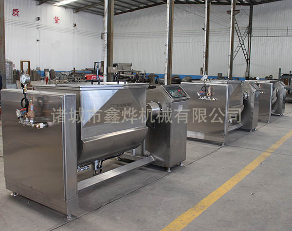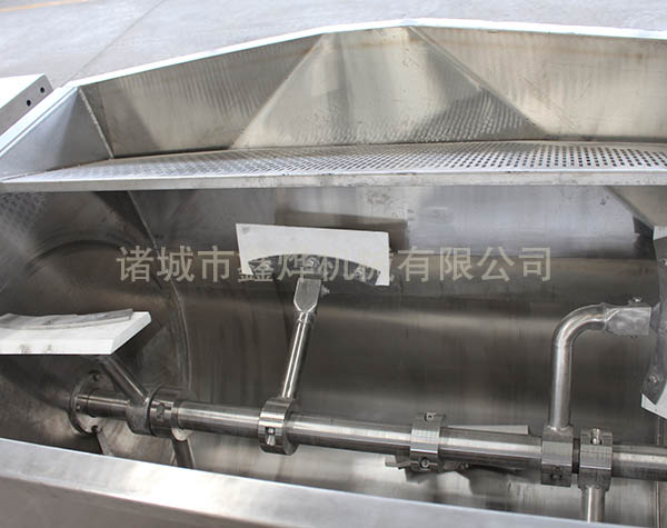 本機的U形鍋頂部抽真空,夾套采用蒸汽加熱,無段變速與蝸輪,減速機的組合傳動,增大了橫軸攪拌的力矩,采用食品級材質(zhì)材質(zhì)刮板的攪拌器,在物料的翻滾攪拌過程中,攪拌器與鍋體的充分接觸,確保了無攪拌死角。鍋體的開蓋,卸料,復位采用液壓,機械傳動控制,操作方便。真空炒制可降低炒制溫度,特別適應于高粘度材料的炒制,避免了因過度受熱引起色澤及口味的變化,保持了物料原有的色香味。提高了炒制效率,并降低能耗,縮短了炒制時間。